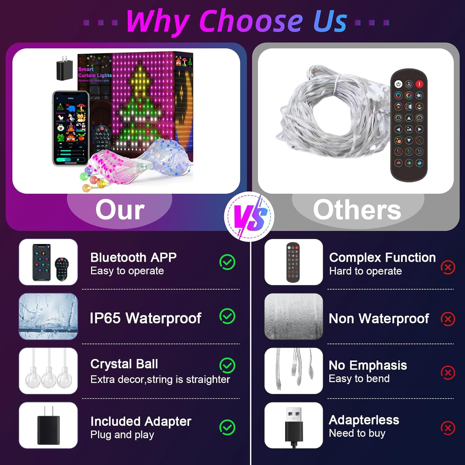 Ideal Holiday Decorations: Our smart curtain lights are 5.25 x 5.25 feet, which can be controlled via app and remote control, has 256 isolated LED lights, capable of rendering high pixel color gradient patterns and text. Easy to install and use, it is ideal for holiday window and wall decorations