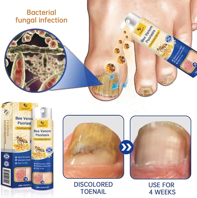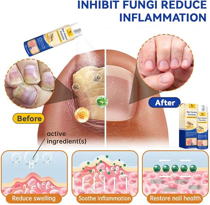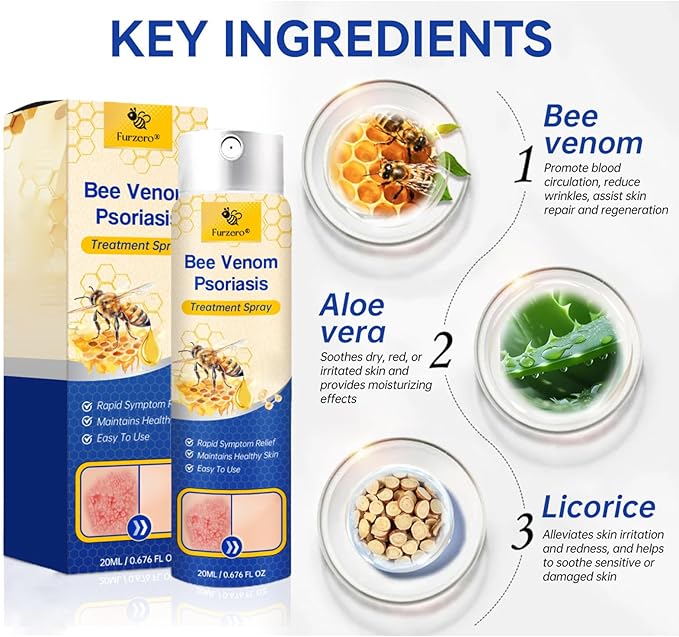 LOVILDS⢠PsoriaHeal Bee Venom Psoriasis Treatment Spray cleanses the skin from the inside out, alleviating itching and inflammation. It is free from irritating chemicals and does not exacerbate already damaged skin. LOVILDS⢠helps minimize the growth of skin cells triggered by psoriasis, providing relief from inflammation, itching, and scaling associated with this condition.